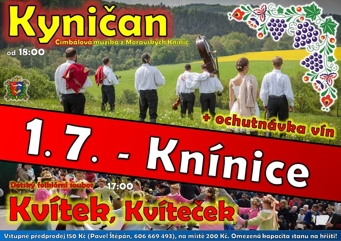 SDH Knínice Vás zve na tradiční ochutnávku vín a Cimbálovou muziku Kyničan z Moravských Knínic. V 17 hodin vystoupí dětský folklórní soubor Kvítek a Kvíteček z Telče.
