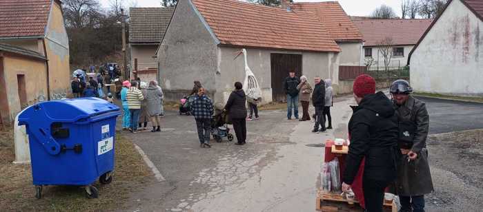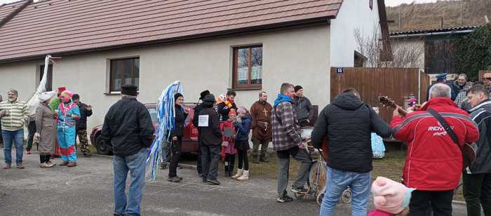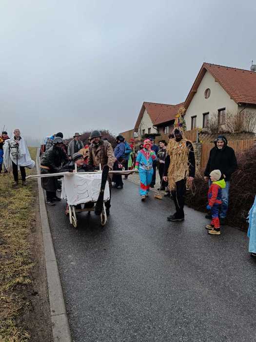 Ještě po druhé světové válce chodil masopustní průvod po vsi po nedělní masopustní zábavě. Nyní chodí maškary po vsi v sobotu a večer následuje masopustní zábava. Organizátorem bývají Požárníci Č.S.Ž, Svazarm. Hlavními účastníky průvodu jsou mladí, ale i starší se zůčastňují. Žen a dívky se průvodu nezůčastňují. Bývá 30 i více maškar. Druh maškar: Cikán vodí kobylu která po skončení průvodu bývá v sále zabíjená, skupina lékařů a čáp který dává děti, zvěřinec který bývá vážen na váze, skupina koz s panákem, šašci, kteří pronásledují děvčata přihlížející průvodu, šenkýři kteří prodávají kořalku (i sud je maska), skupina fotografů která prodává legrační obrázky, dráteníci kteří hospodyňkám opravují hrnce, ale i děvčatům střevíce, nevěsta, ženich a kecal, skupina indiánů, kolovrátkář a j. V každém domě dostávají peněžitou odměnu. Před druhou světovou válkou dostávali také vejce a koblihy. Průvod doprovází hudba která bude večer hrát o taneční zábavě. Ještě krátce po druhé světové válce chodíval náš maškarní průvod v sousedních Radkovicích. Před druhou světovou válkou býval rovněž větší, masky jsou v podstatě stejné. Občané a mládež i starší ze sousedních vsí průvod doprovázejí. Ještě do druhé světové války se udržovala pověra, že čím více hospodyně v masopustě tancovala tím delší bude míti toho roku len.