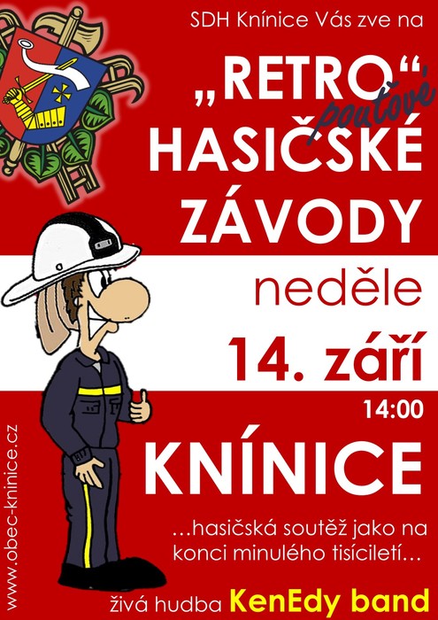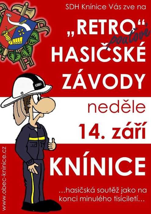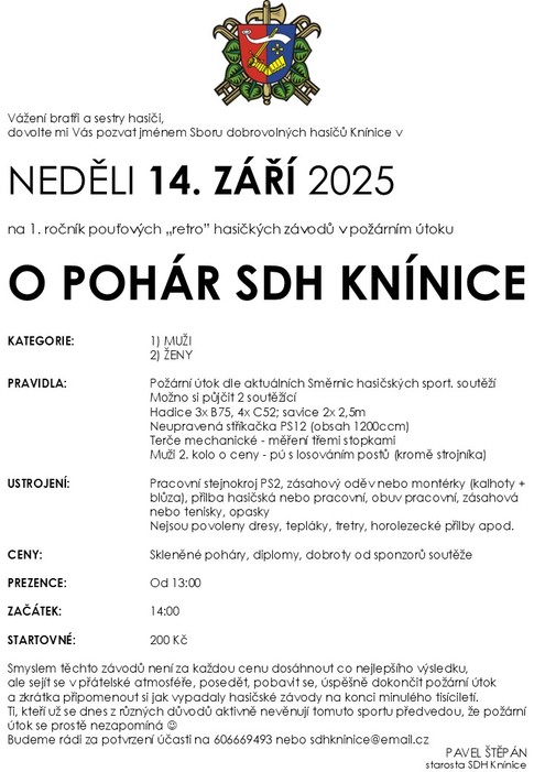 Sbor dobrovolných hasičů Knínice Vás zve v neděli 14. září 2025 od 14:00 na "retro" hasičské závody. Hasičské závody tak jak vypadaly na konci minulého tisíciletí.... žádné dresy, elasťáky, tretry, hádání a honba za výsledkem... prostě pohodová pouťová neděle, nezapomenutelné požární útoky, dobré jídlo, pivo jako křen a spousta zábavy.