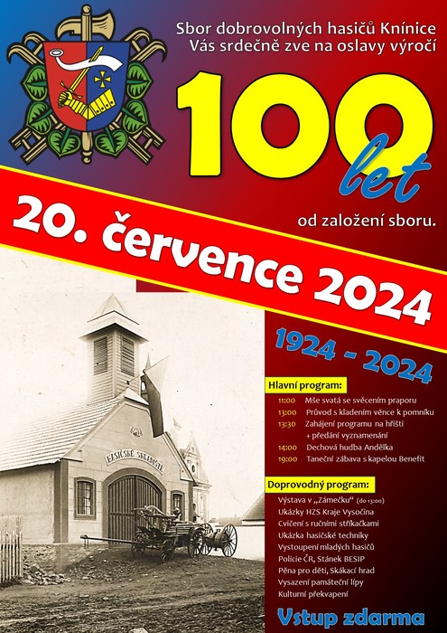 Sbor dobrovolných hasičů Knínice Vás srdečně zve v sobotu 20. července na oslavy 100. výročí od založení sboru.